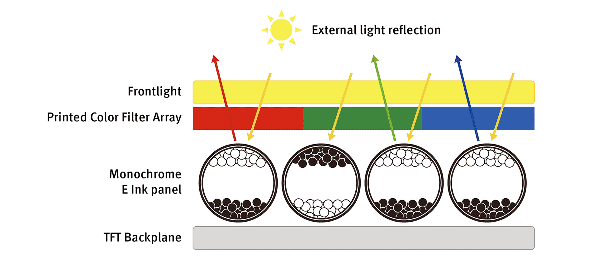 An E Ink Kaleido™ Module is comprised of a TFT backplane, Ink layer, Color Filter layer and Protective Sheet.