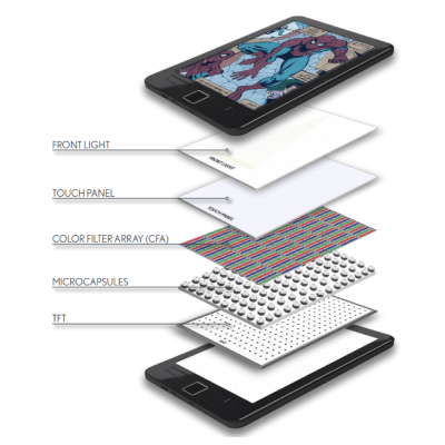 E Ink Kaleido™ utilizes a new printed Color Filter Array (CFA) technology in conjunction with E Ink's second generation Carta ink, which is faster and brighter than previous generations. The new printing process facilitates the need for a glass-based CFA, making the displays thinner and lighter than previous generations, while simultaneously having higher optical quality. This allows eReader companies to combine the power of traditional black and white displays with color for a more fully realized eBook shopping experience. for animations and page turns. With this new color technology, E Ink's eNote product lines are now able to introduce writing tablets with color highlighters, pens and markers, giving new options for education and professional devices.