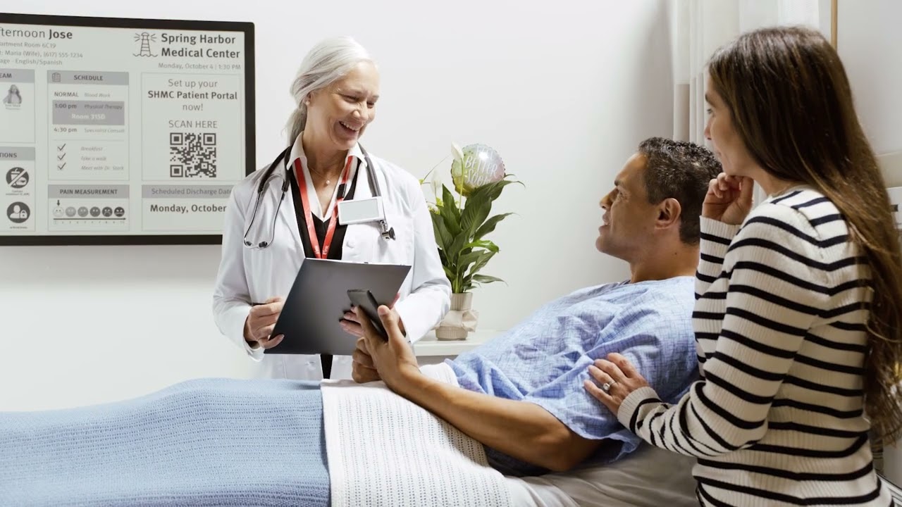 This Board sits in the patient's room and is design to be a communication portal between the patient, their care team and their family and friends, and can show the patient's discharge information so the patient and family know the schedule and can prepare; can show detailed information related to the medicine and treatment the patient is receiving; can show messages from the patient's family, which can be logged into the EHR / EMR system, among other features.
